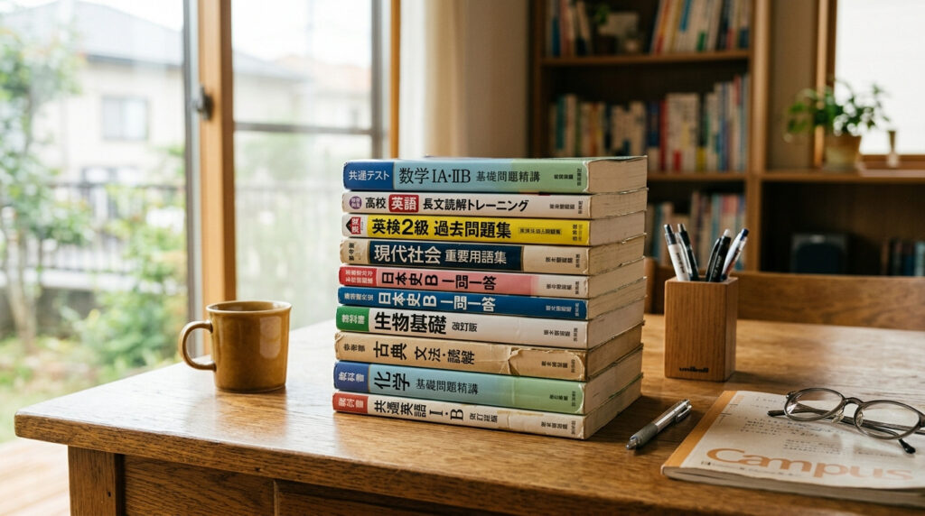 受験が終わったあとに残りやすいのが、英語、数学、国語、理科、社会の参考書と、志望校対策で使った赤本や過去問題集です。同じ年度の本だけでなく、学年が上がるたびに買い足した問題集や、模試対策本、共通テスト対策本が混ざっていることもあります。
