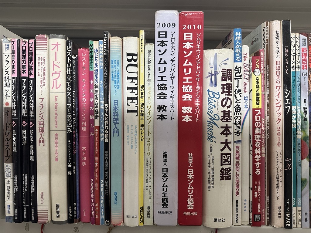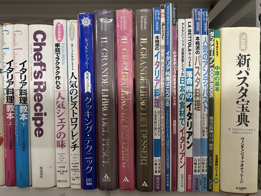 今回お譲りいただいたのは、フランス料理・イタリア料理を中心とした料理専門書およびレシピ本のまとまったご整理でした。百科事典、技術書、実用書、専門誌まで幅広く揃っており、調理技術・理論・実践という料理書籍の王道が一式揃った印象を受けました。パスタ、ソース、ポタージュ、魚料理、肉料理、デザート、さらにはワイン関連の書籍まで含まれており、長年にわたり知識を積み重ねてこられたご蔵書であることが静かに伝わってまいりました。