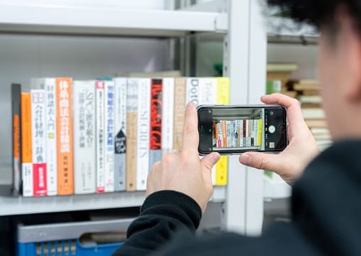 下の写真のように、スマートフォンを横にして、本の背表紙が認識できる距離で並べた専門書を撮影いただきます。